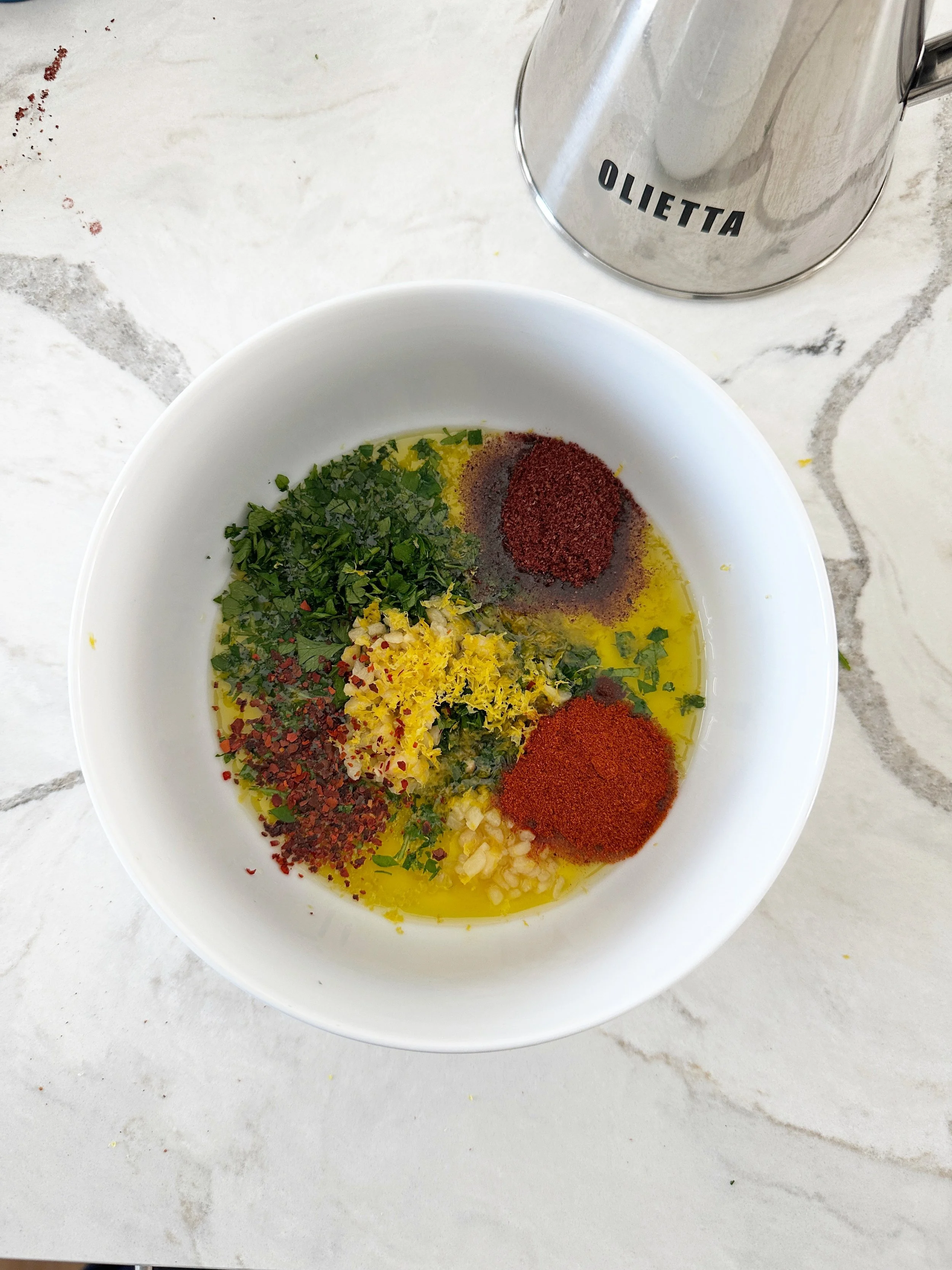 In a small bowl, mix together the olive oil, honey, parsley, garlic, lemon zest, sumac, paprika and cayenne.
