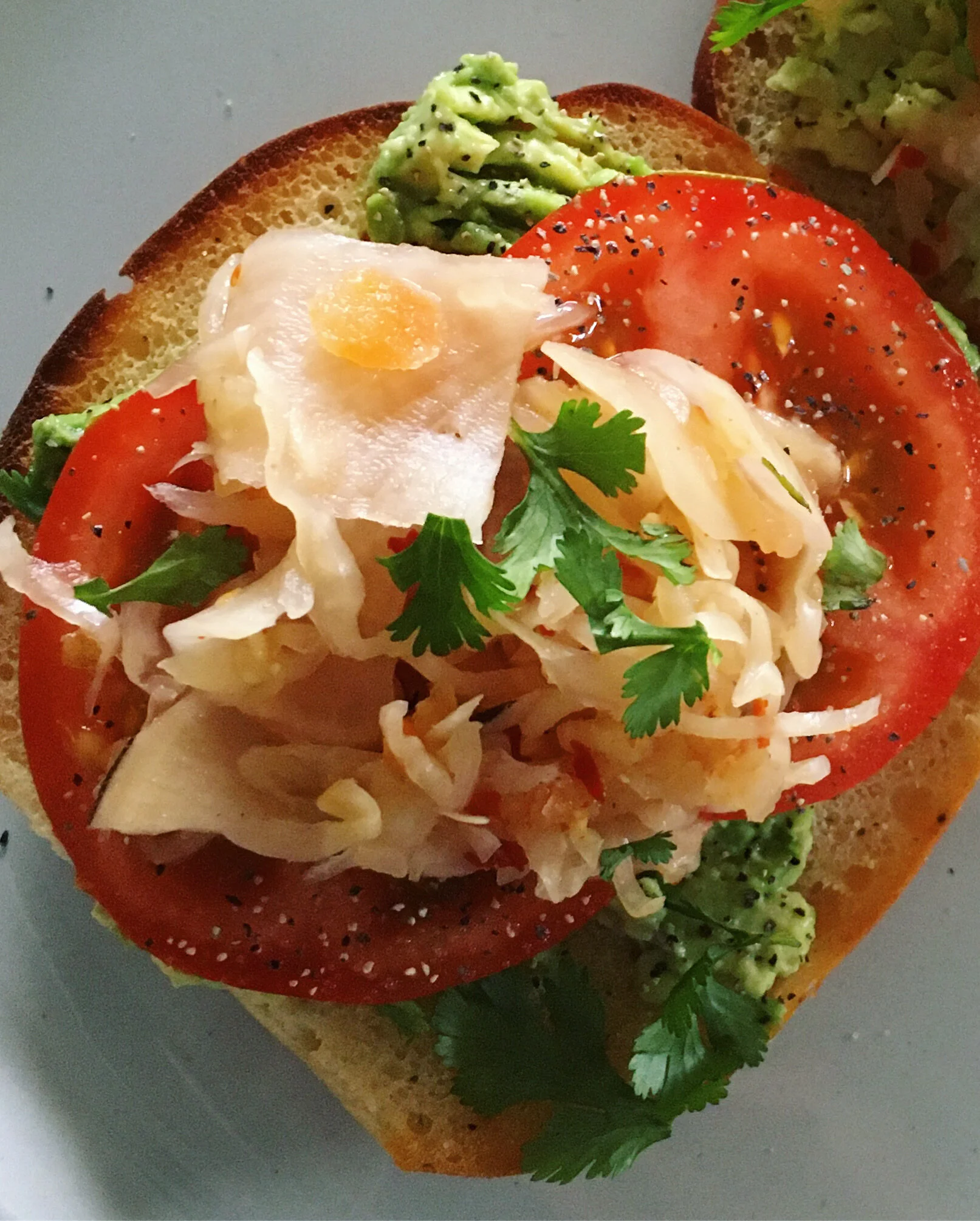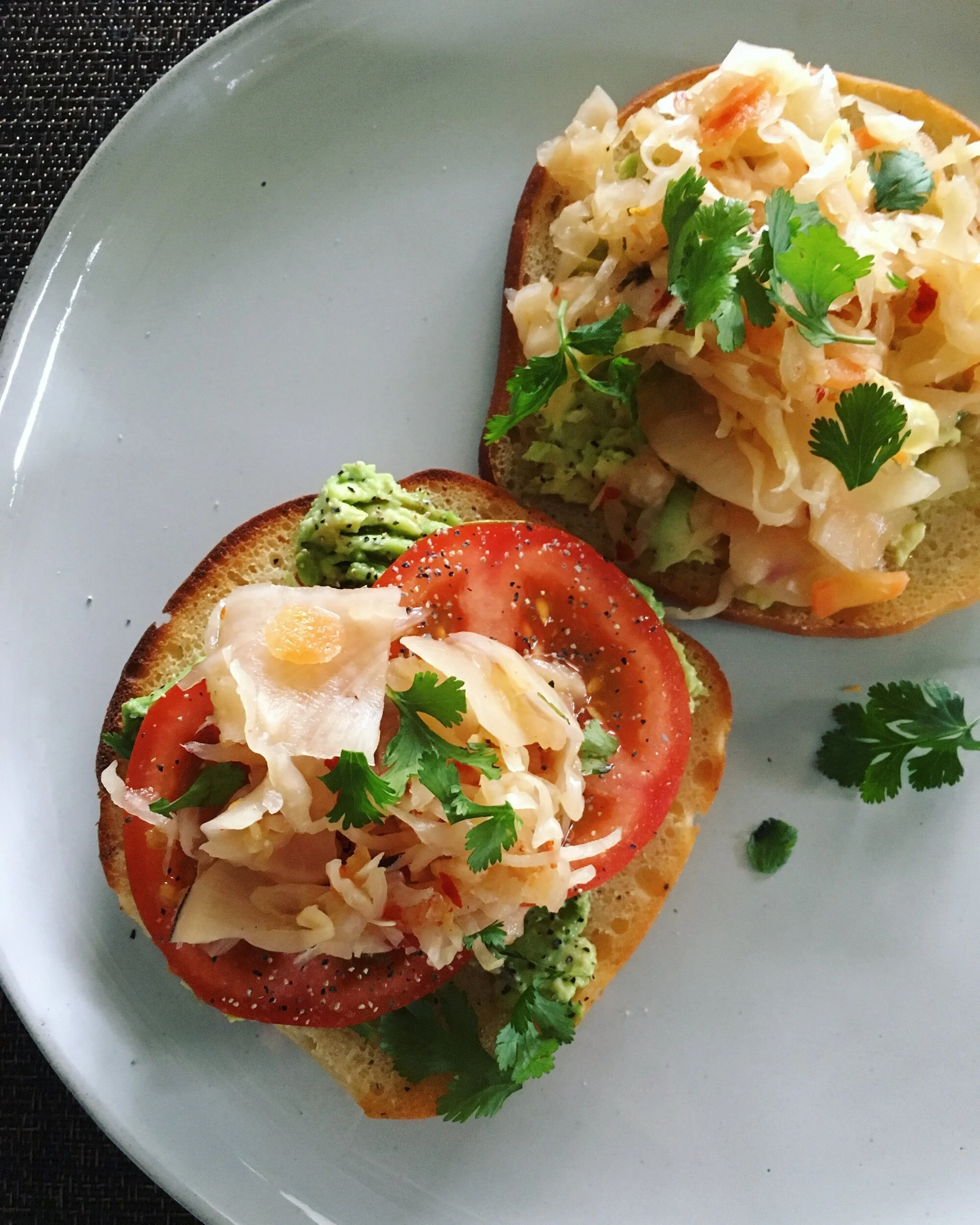 To assemble: Toast bread (I use a vegan bread) and spread mashed avocado on the bread. Then top with slices of tomato and mounds of kimchi. I like to season the tomato with salt and pepper. Finish with some cilantro (optional). Serve and enjoy!