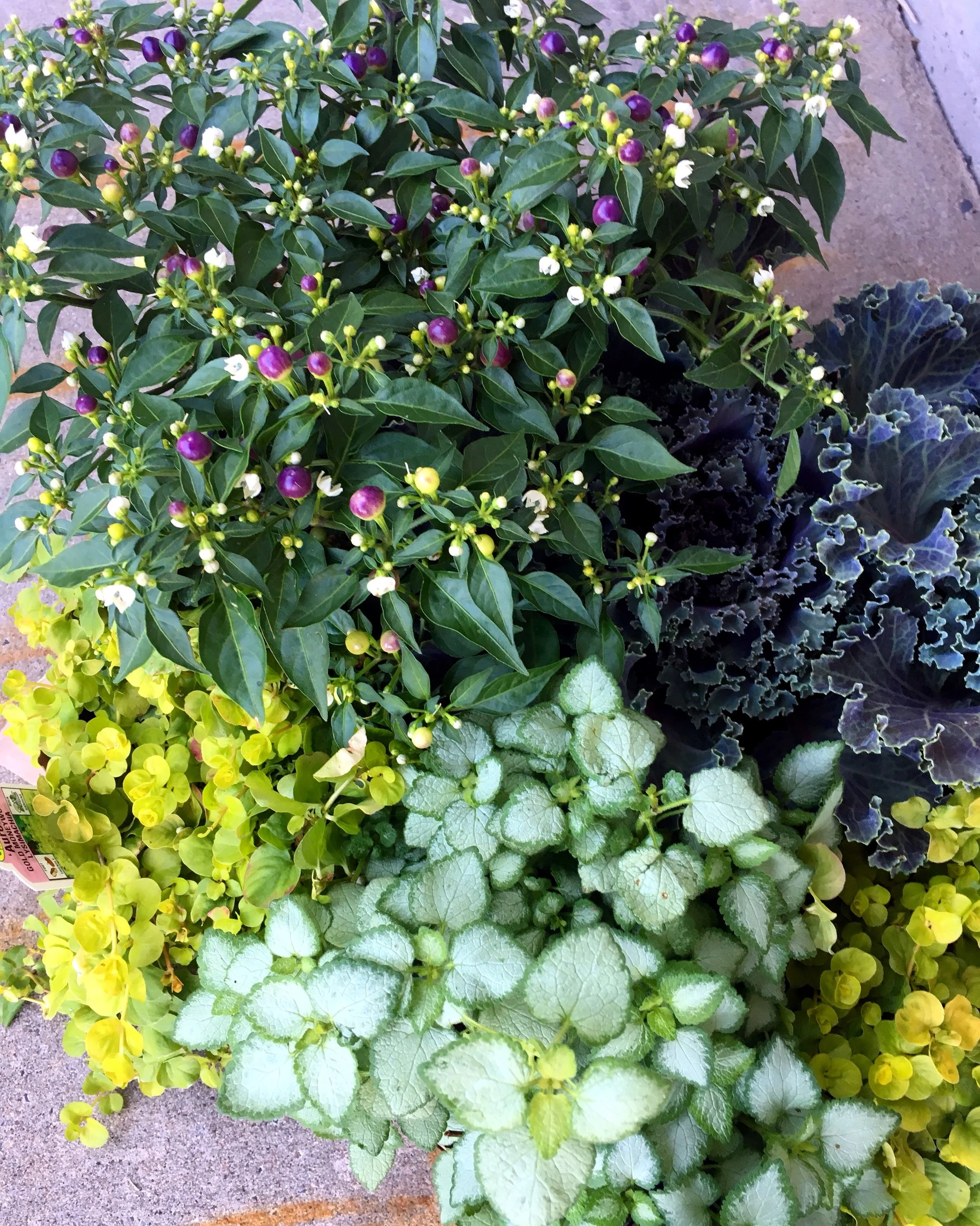 In a larger container I added some transition flowers, including two Kamome Red (Flowering Kale) which will change colors as the weather gets cooler, and the coolest ornamental pepper plant that will fill in nicely the size of the pot.